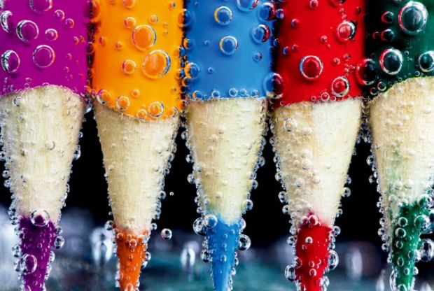 在我们取景构图的时候,尽量不要在铅笔下方留白太多,这样会削弱画面的表现力。水泡会在过大的画面中变得太小,以至于看不清楚。这时,我们不妨裁切掉下面部分,让画面更饱和。另外,记得在对焦的时候使用手动对焦,自动对焦常常会对焦在玻璃上,以至于画面模糊。
